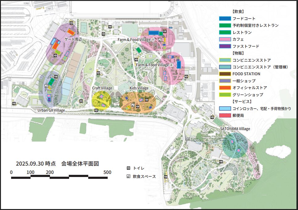 レストランやカフェ、ショップ、トイレの位置など(2025.9.30時点)