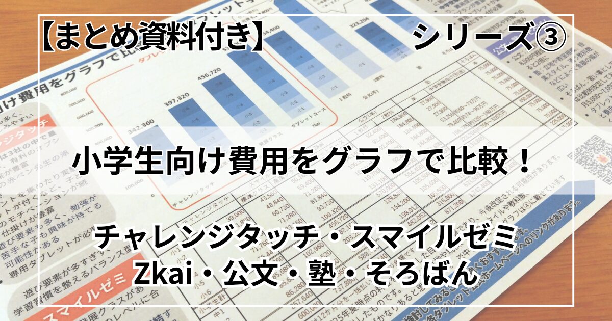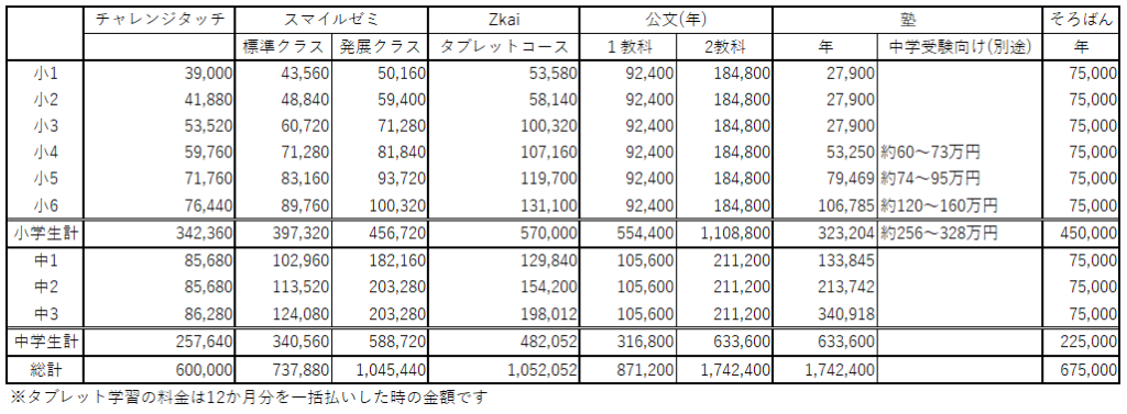 今回、スマイルゼミ・チャレンジタッチ・Z会を中心に、公文や塾とも費用を比較してきました。