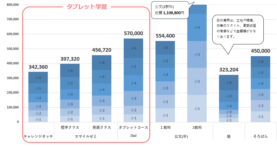 小学生向け費用をグラフで比較!タブレット学習と公文・塾の違い