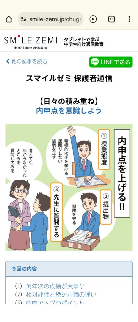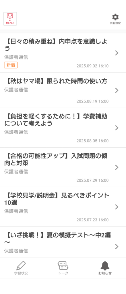 専用アプリ内の「お知らせ」に月に数回、勉強のさせ方や受験についてのアドバイスが送られてきます。LINEに転送できるようになっているのが便利です。