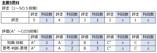 これは息子の中1終了時の主要5教科の評定と評価の数を表したものです。(息子よ晒してごめん💦)