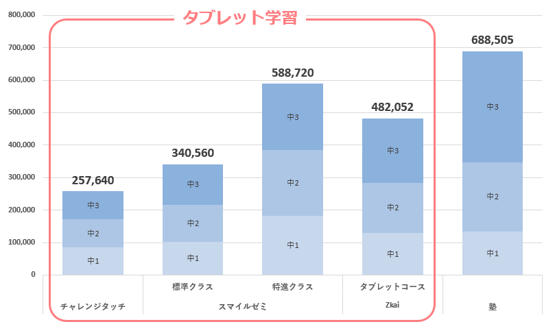 中学3年間で見ると、スマイルゼミ標準コースは約34万円、特進コースは約59万円。塾の場合は年間費用に加えて講習費などもかかるため、さらに高額になるケースが多いです。