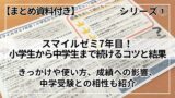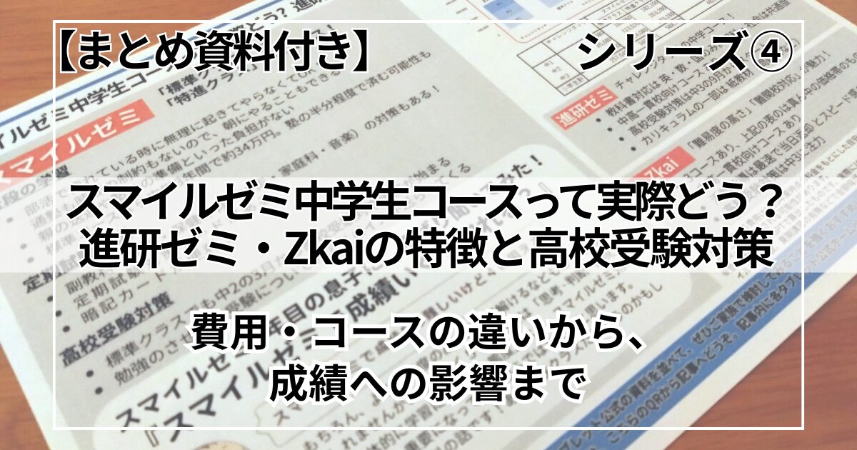 小学生のときはしっかり利用していたスマイルゼミも、中学生になると使い方が変わってきました。④では小学生コースとの違い、費用、感じている効果と、進研ゼミ(小学生時のチャレンジタッチ)・Zkaiの中学生コースなどについてまとめました。