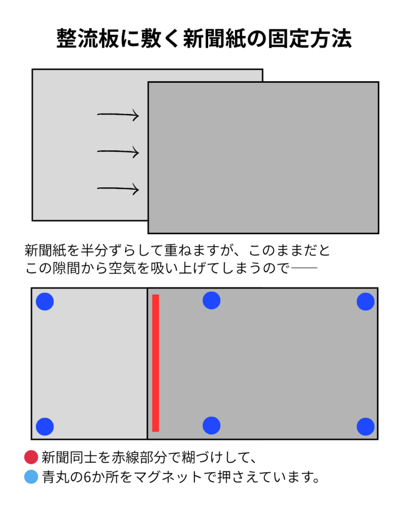 私は新聞が浮かないように糊や磁石で下のイラストのように固定していますが、あくまでも自己責任で…。