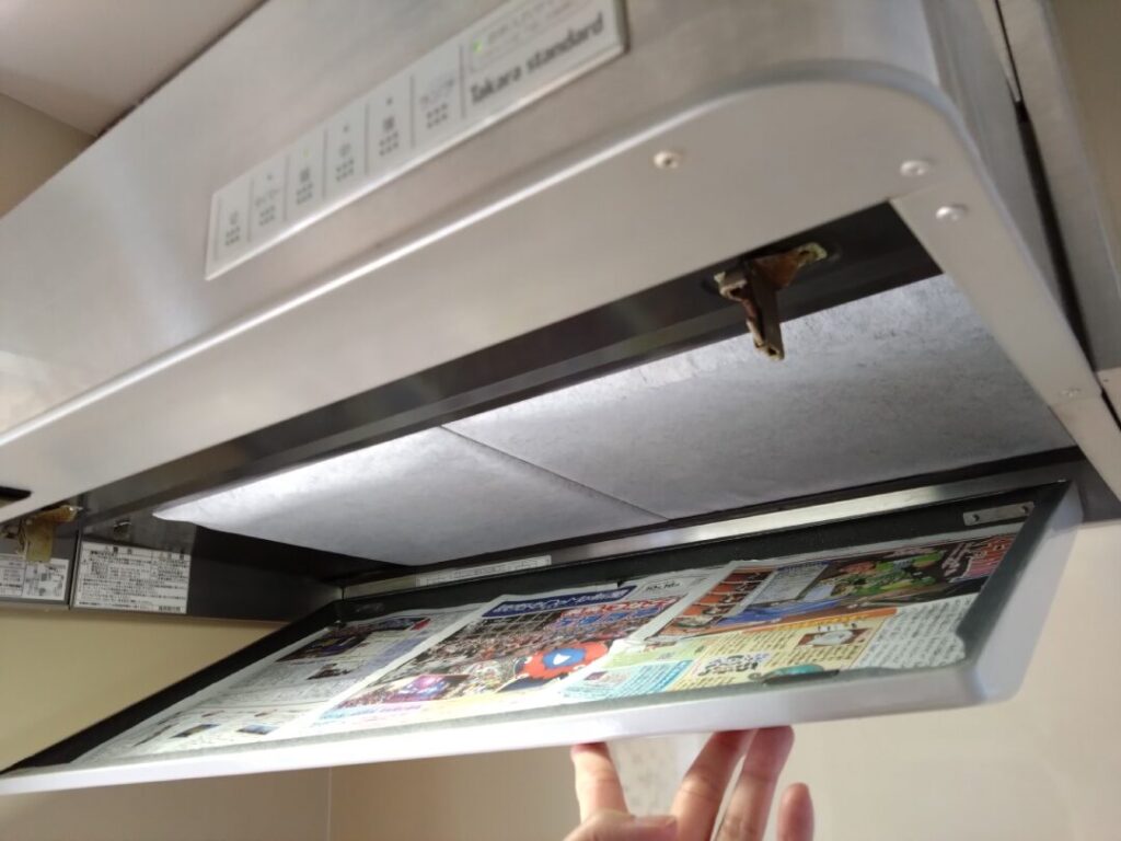 メーカーにもよると思いますが、うちのレンジフードはタブロイド紙なら3面分、一般紙なら1.5面分になります。